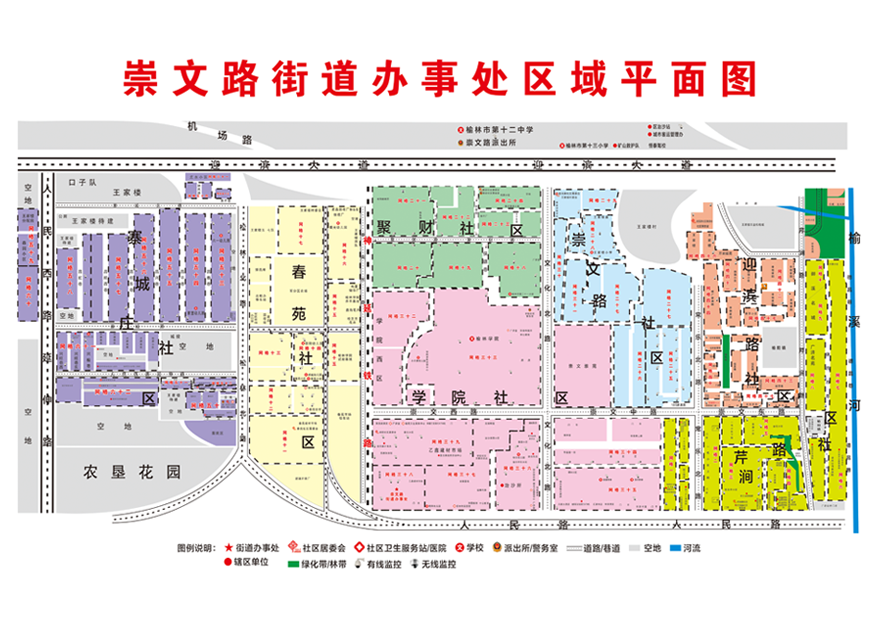 崇文路街道位于榆林城区西北部,东邻榆溪河,西接芹河镇口则队村,南起人民路,北至迎宾大道,属于典型的城乡结合部。辖区总面积约12平方公里,总人口74360人,常住人口31154人,流动人口43206人。辖有7个社区、29个企事业单位、67个“双报到”单位党组织、6个“两新”党组织。